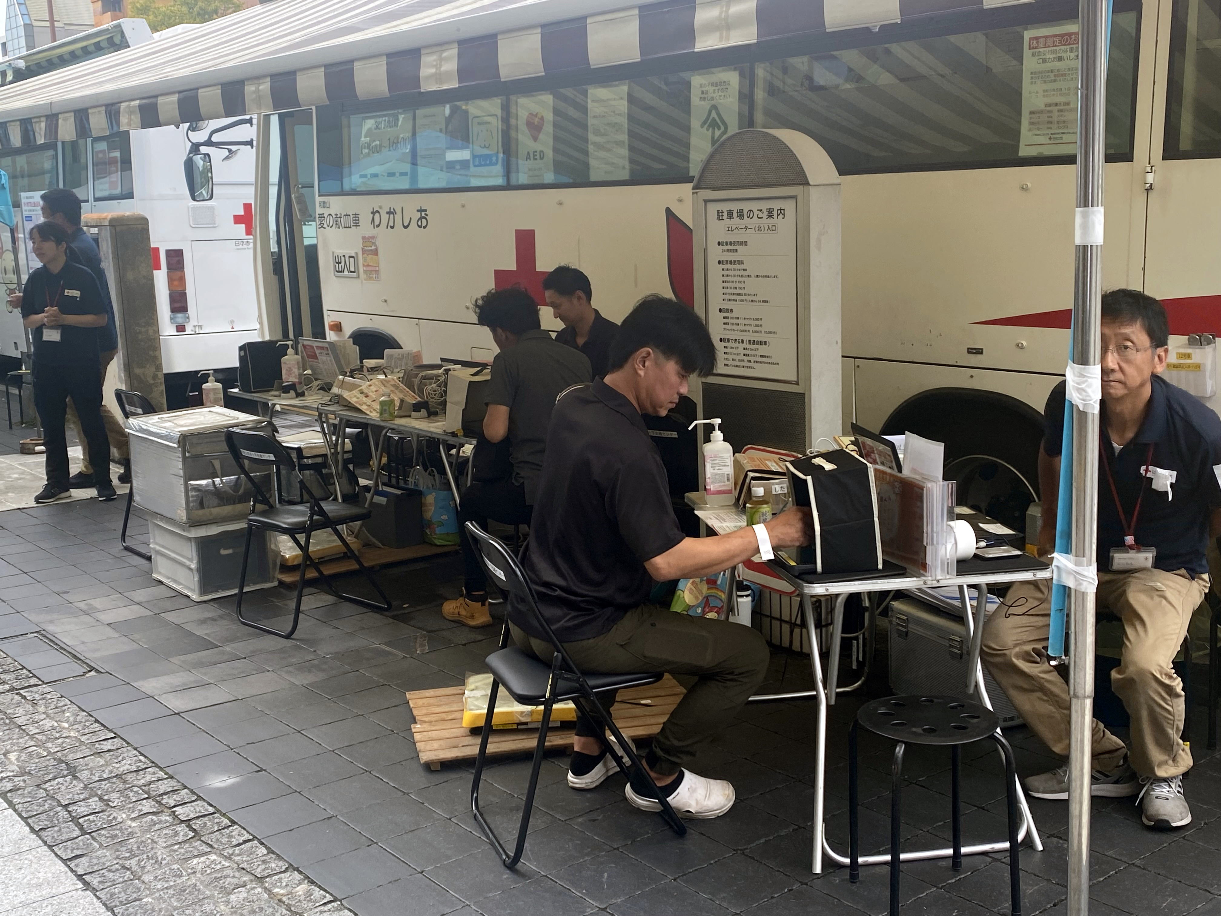 今回で23回目となる献血活動ですが、平成11年からコロナ禍を除いて、毎年この時期に行なっています。会場には献血バスが2台用意され、愛和会会員やその家族の方々が献血を行うとともに通行人の方にも献血への協力を呼びかけ、180名の方にご参加いただきました。