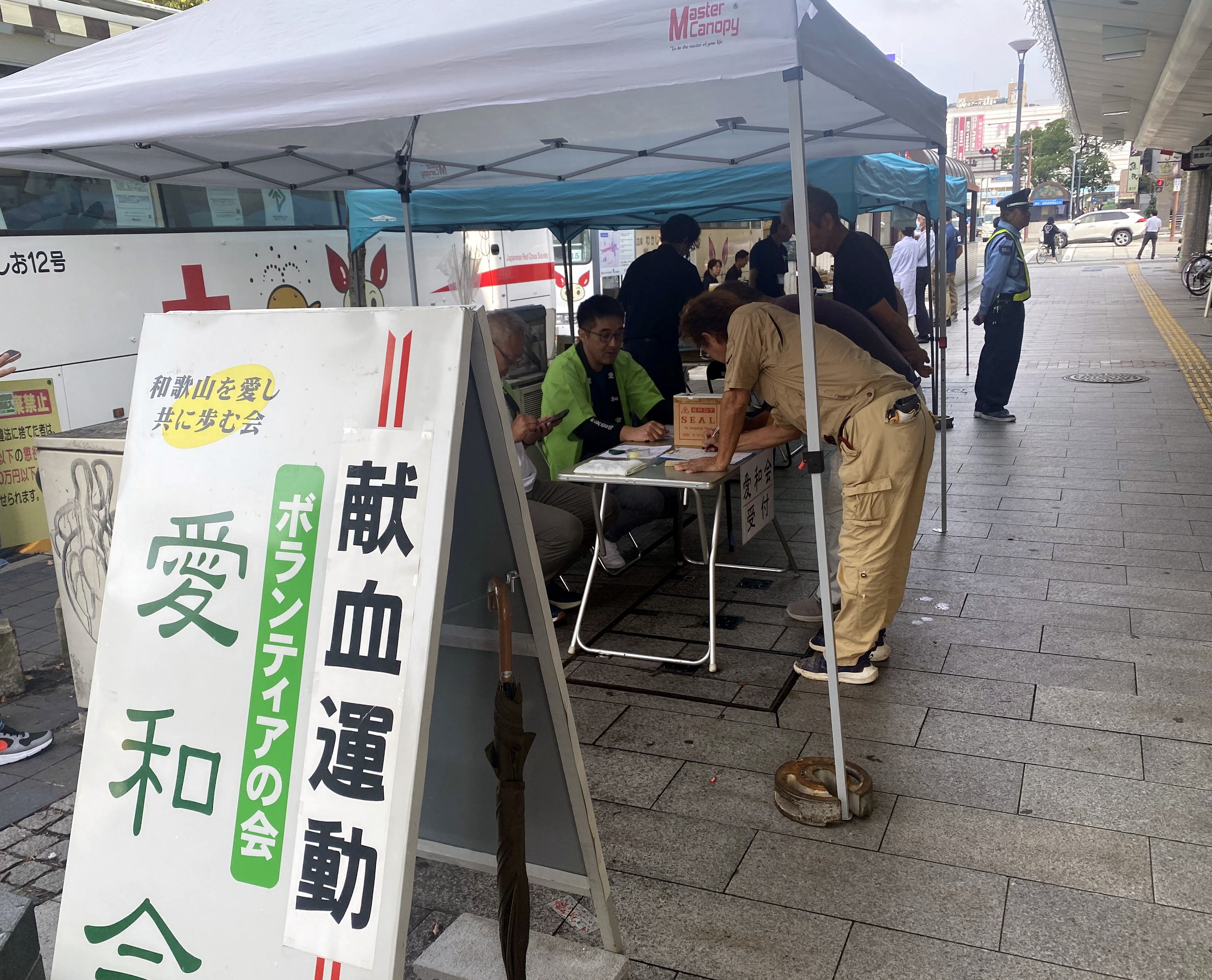輸血用の血液が慢性的に足りなくなる寒い時期を迎えるのに合わせて、当社とその関連企業からなるボランティア団体「愛和会(塚本治雄会長)」による献血活動をJR和歌山駅前、けやき大通り沿いで行ないました。