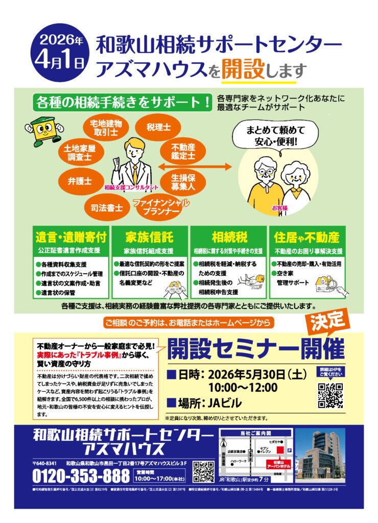 このたびアズマハウス株式会社は、2026年4月1日(水)、「和歌山相続サポートセンター アズマハウス」を開設いたしました。